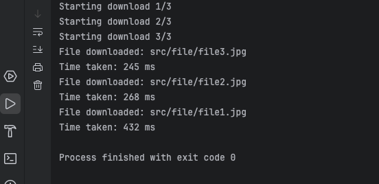 프로그램을 실행하면 각 파일의 다운로드가 동시에 시작되며, 다운로드 완료 후 파일 이름과 소요 시간이 다음처럼 출력됩니다.