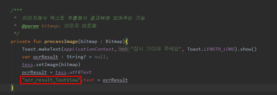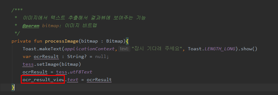 processImage(BitmapFactory.decodeResource(resources,R.drawable.sample_kor)) //이미지 가공후 텍스트뷰에 띄우기