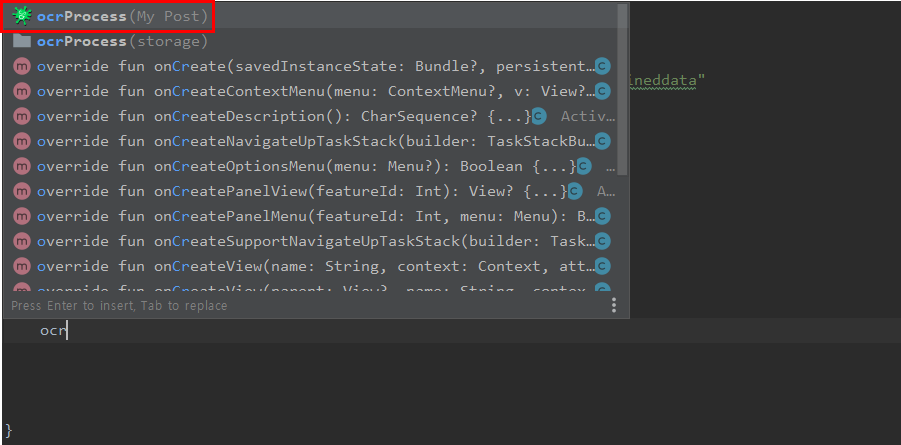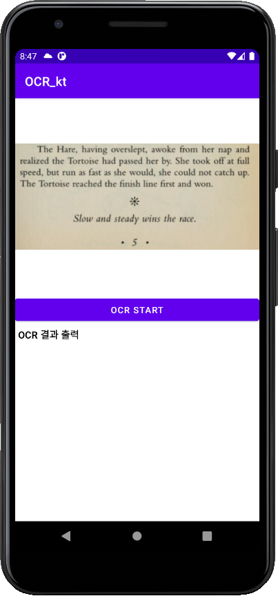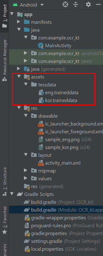 ▶ 필요한 샘플 이미지 파일과 언어 데이터를 OCR 모듈에 세팅해줍니다. 그리고 MainActivity 아래쪽에 스틱코드를 이용해서 OCR 동작 기능을 추가해줍니다.