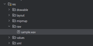 => 위 이미지와 같이 앱의 res 폴더 내에 raw 폴더 생성 후 재생할 음악 파일을 저장시켜 주세요