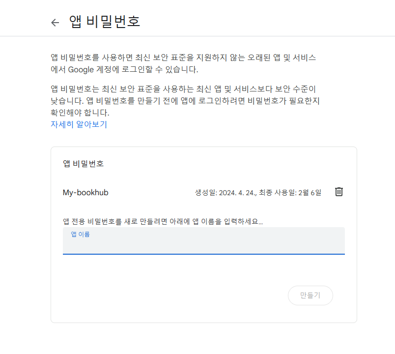 // Google 앱 비밀번호 발급 방법: 구글 계정 -> 보안 설정 -> 앱 비밀번호 메뉴 이동 -> 앱 이름 새로 만들기 -> 비번 생성됨