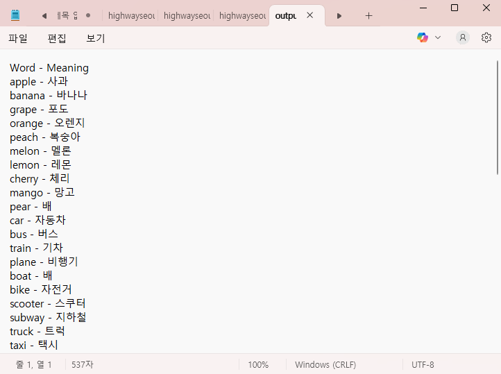 위 코드를 실행 시키면 지정된 경로에 엑셀 파일이 텍스트 파일로 변환되어 저장됩니다
