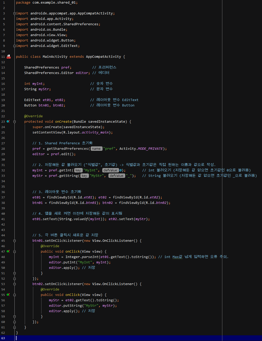 이번 시간에는 Shared Preferences를 사용하여 숫자와 문자를 저장해보겠습니다.