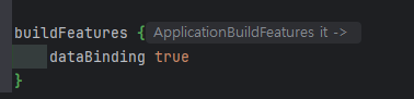 => 모듈 수준의 build.gradle 파일 에서 android{ } 블록 내에 위 이미지와 같이 입력하여 databinding 기능을 활성화 시켜주세요.