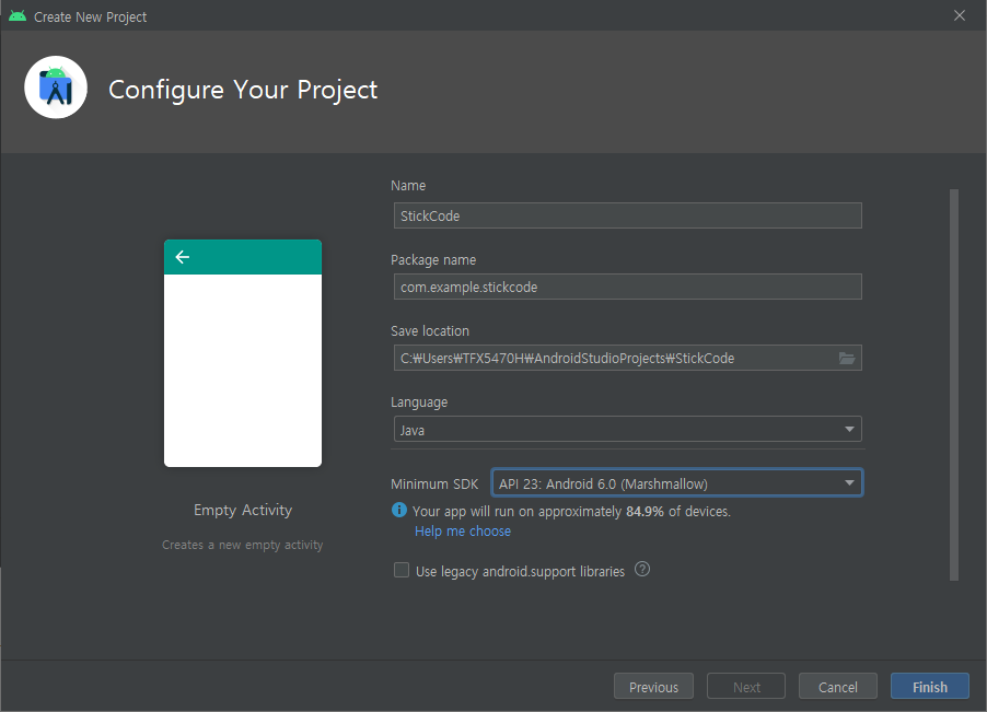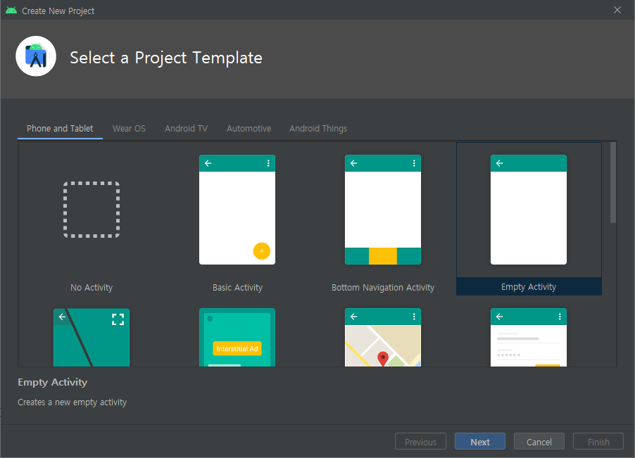 ▶ 초기 템플릿을 설정하는 창입니다 Empty Activity로 만들어줍니다.