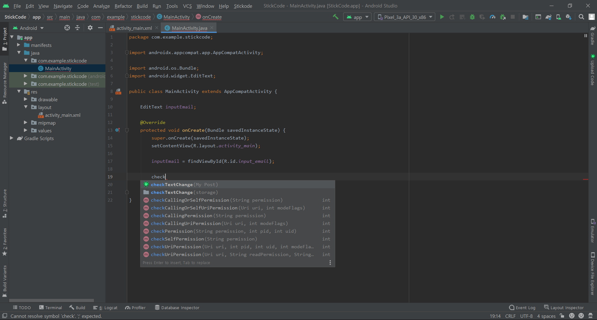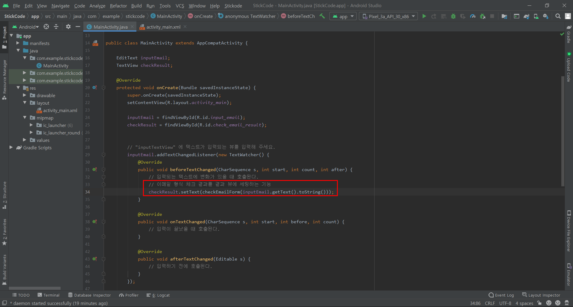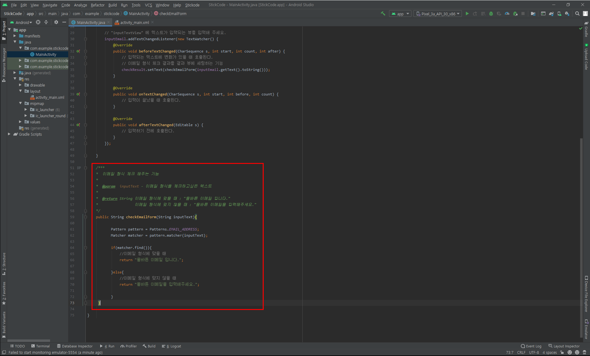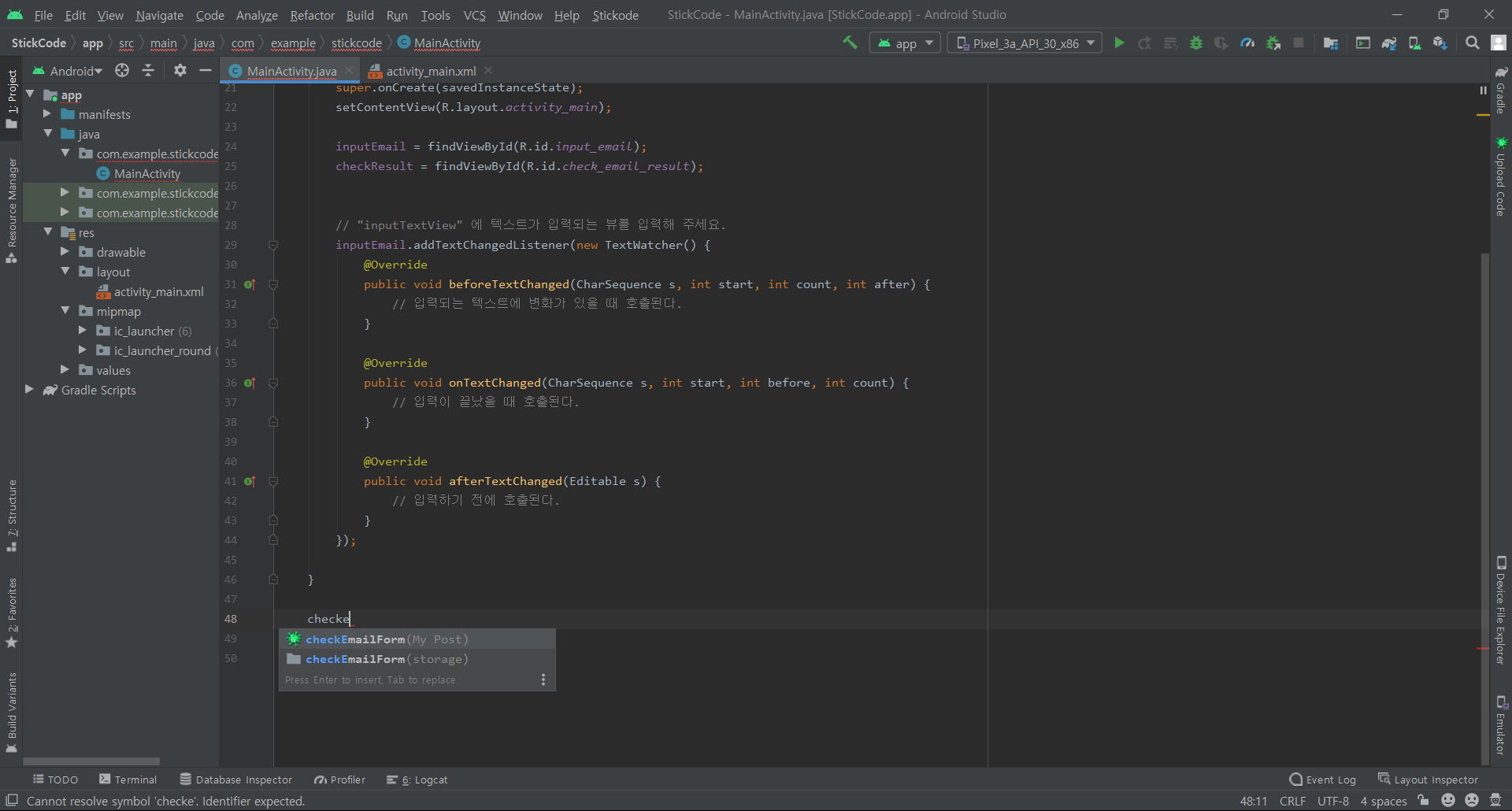 오늘은 안드로이드에서 스틱 코드를 사용해 이메일 형식을 체크하는 기능을 한번 만들어 보겠습니다 : )