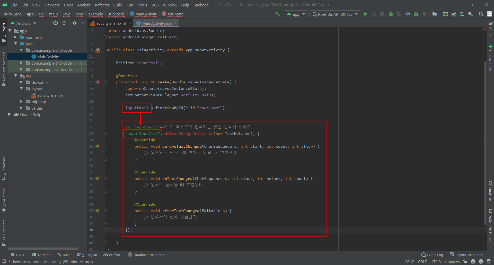 ▶ 불러온 코드의 "inputTextView" 부분에 inputEmail을 입력해 줍니다.