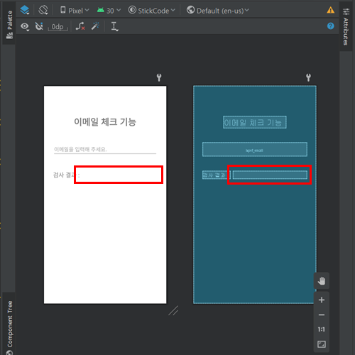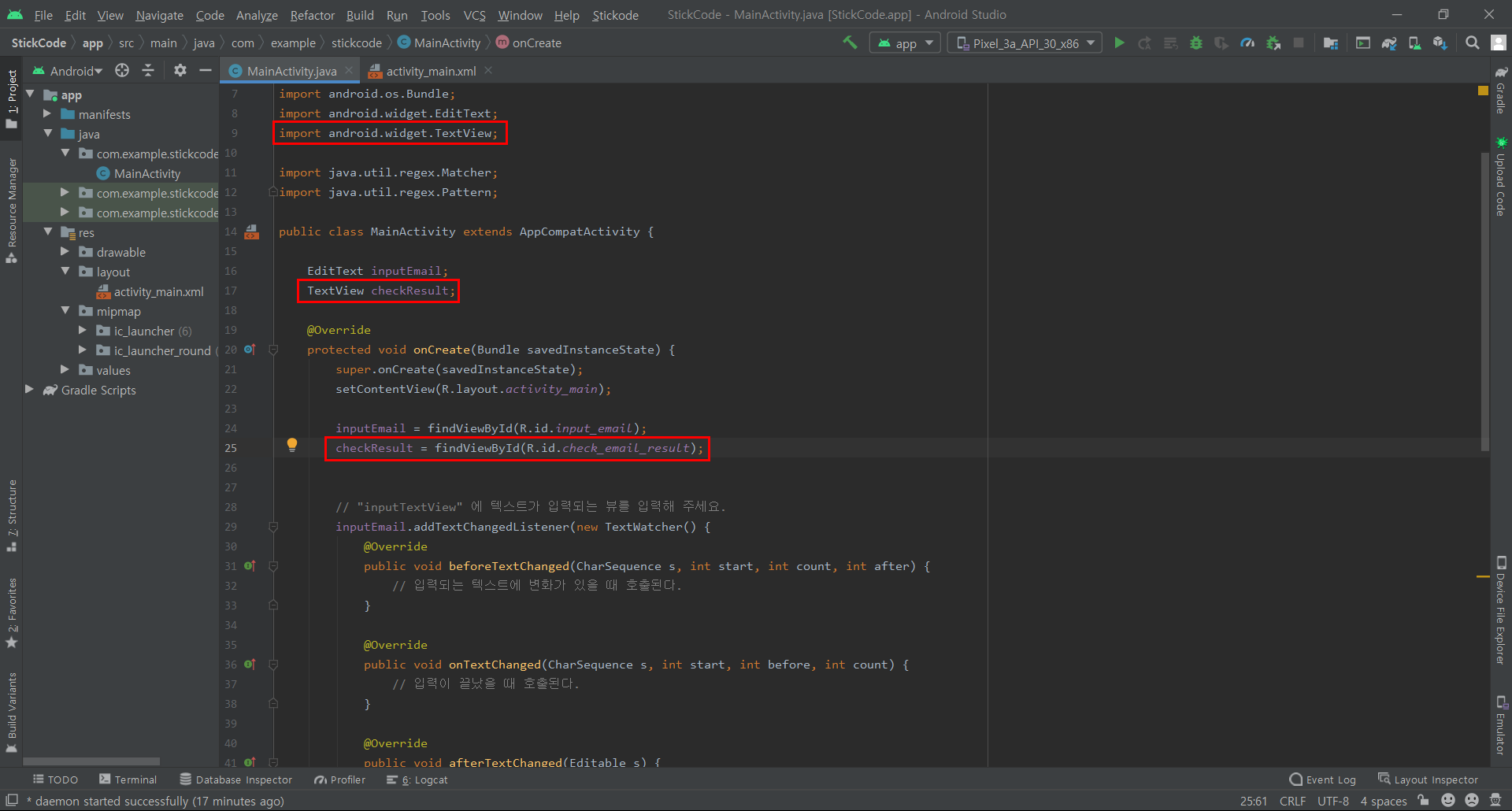 ▶ 위에서 만든 레이아웃에서 이메일 정규식을 검사한 결과 값을 띄워주는 뷰의 아이디 값에 textView 변수와 연결해주는 작업입니다.