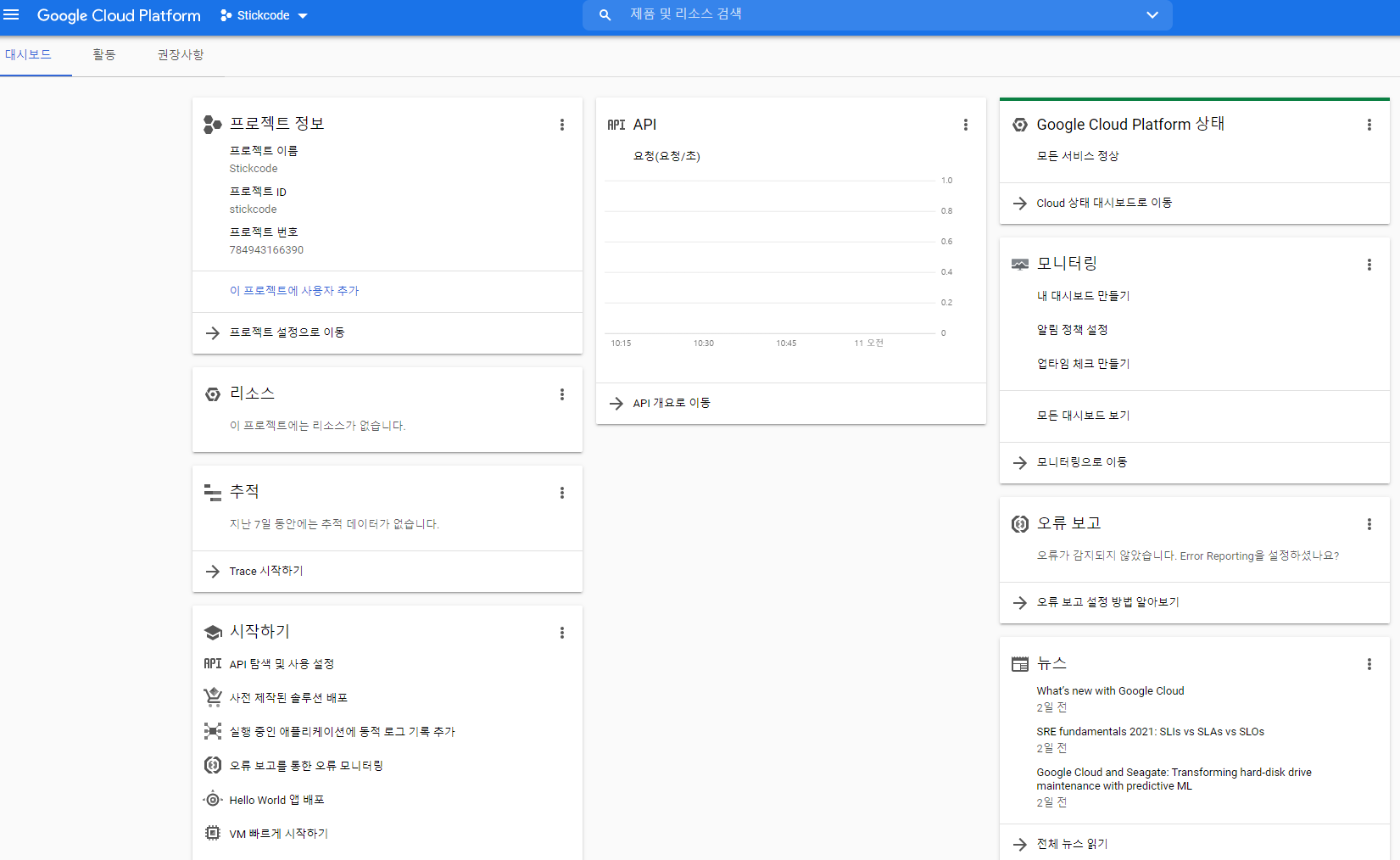 위의 주소로 접속해서 구글 클라우드 플랫폼 우측을 클릭하면, 아래와 같은 화면이 나오며 프로젝트 생성이 가능합니다.