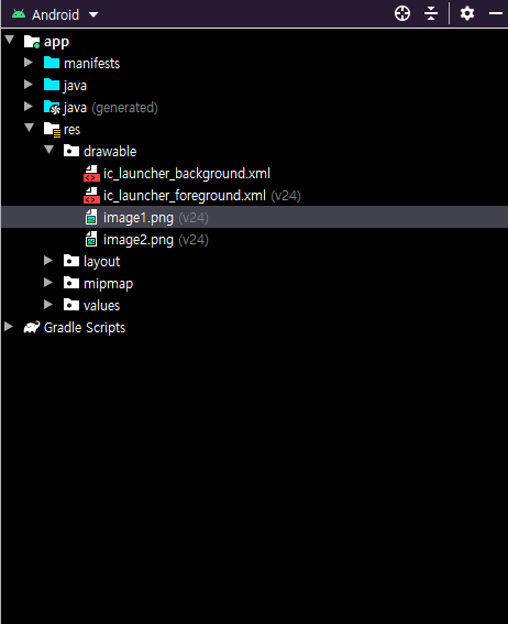 그리고 이미지 2개를 준비해주시고 drawble 안에 넣어주세요(예제는 png파일입니다.)