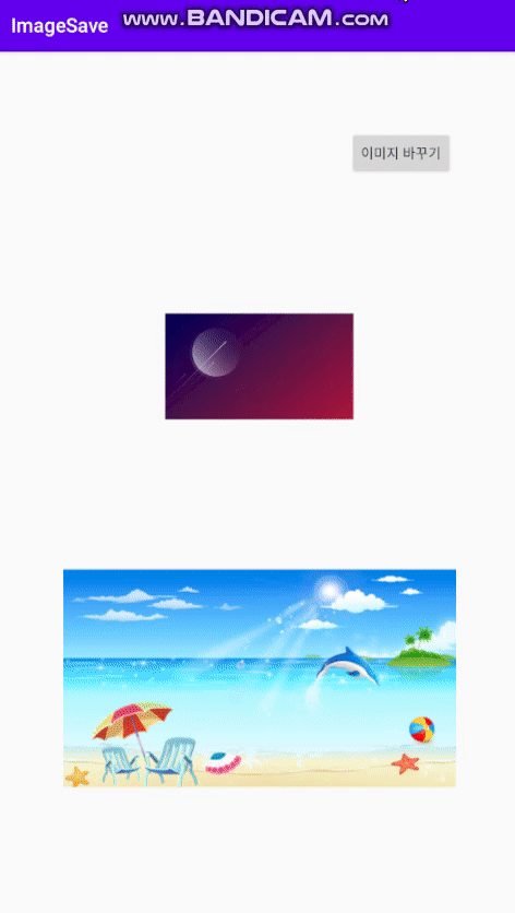 버튼을 누르면 이미지가 바뀌고 저장됩니다. 앱을 종료한 후 다시 실행하면 이전에 바뀌었던 이미지가 저장되어 있는 것을 확인 할 수 있습니다.