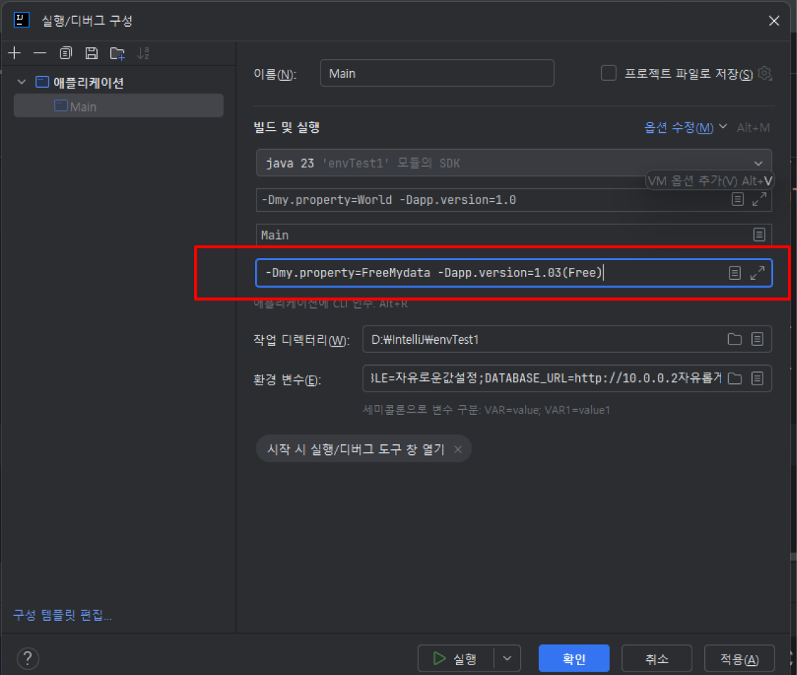 작성코드: -Dmy.property=FreeMydata -Dapp.version=1.03(Free)