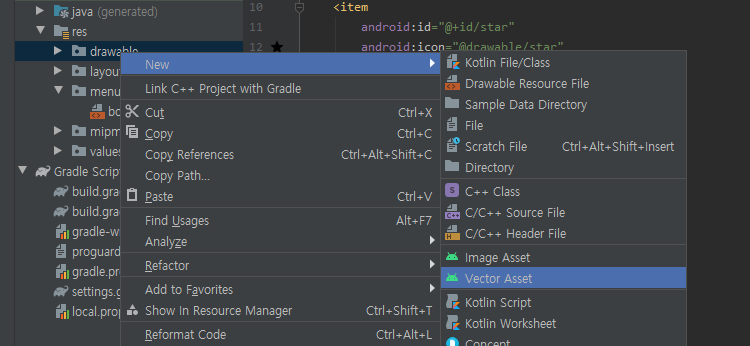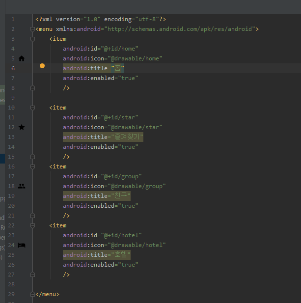 이제 bottom_menu.xml 파일의 셋팅이 끝났습니다.