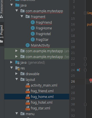 저는 다음과 같이 프래그먼트로 사용할 클래스파일들을 생성해주었습니다.