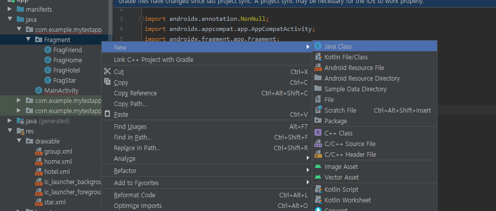 프래그먼트로 사용할 클래스 파일을 생성해줍니다.