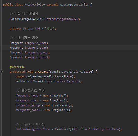 메인액티비티에서 프래그먼트와 바텀네비게이션을 선언해주겠습니다.