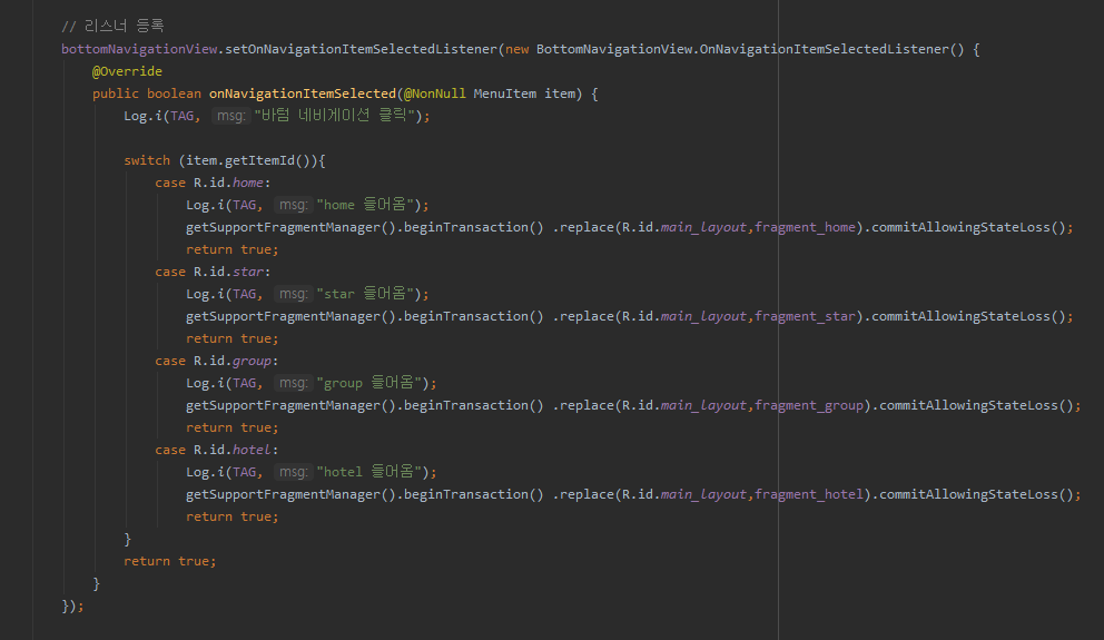 바텀네비게이션을 클릭하면 해당 프래그먼트가 보이도록 설정해보록하겠습니다.