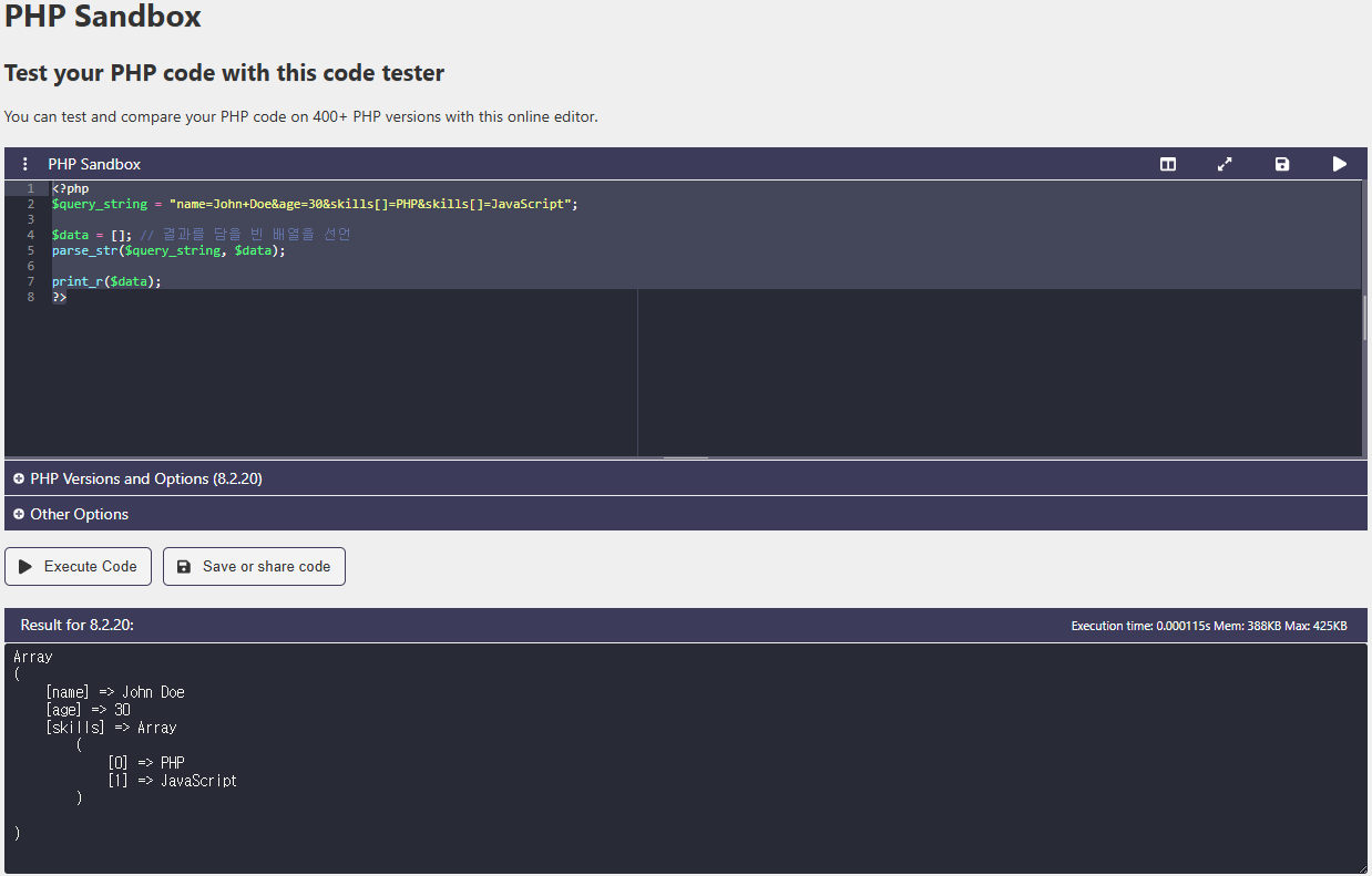 // 2. parse_str()의 두 번째 인자로 배열 변수를 넘겨줍니다.