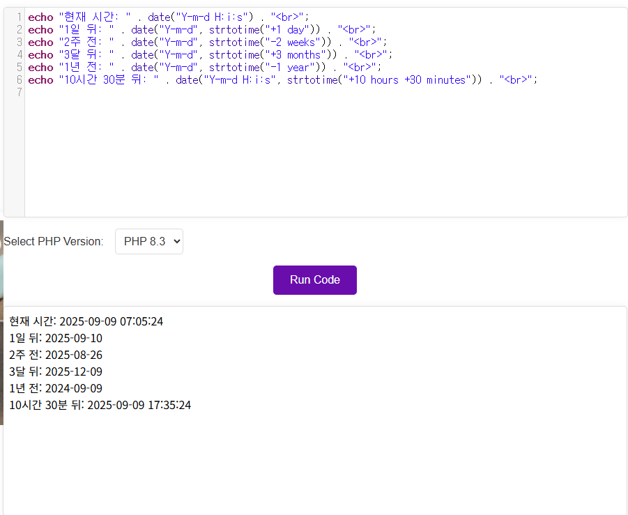 echo "1일 뒤: " . date("Y-m-d", strtotime("+1 day")) . "<br>";