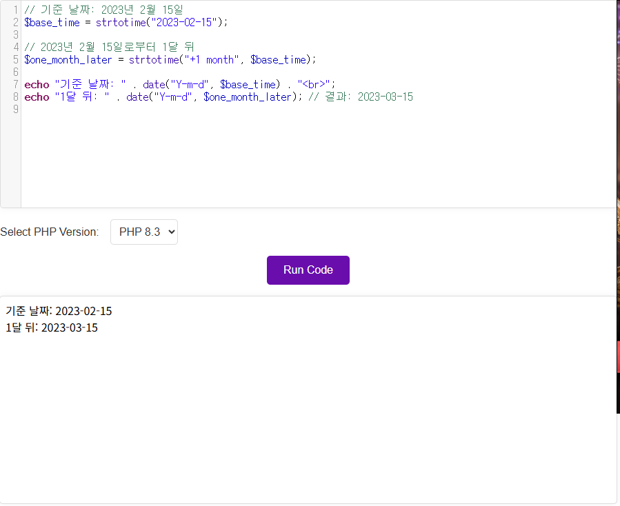 echo "1달 뒤: " . date("Y-m-d", $one_month_later); // 결과: 2023-03-15