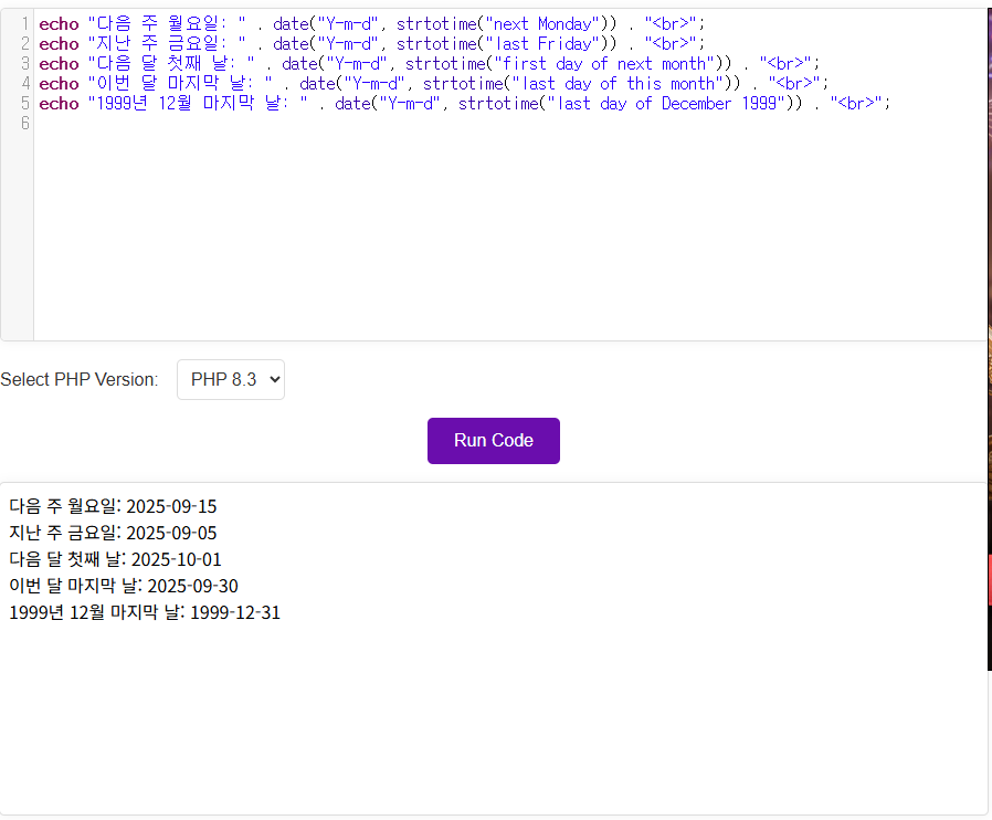 echo "1999년 12월 마지막 날: " . date("Y-m-d", strtotime("last day of December 1999")) . "<br>";