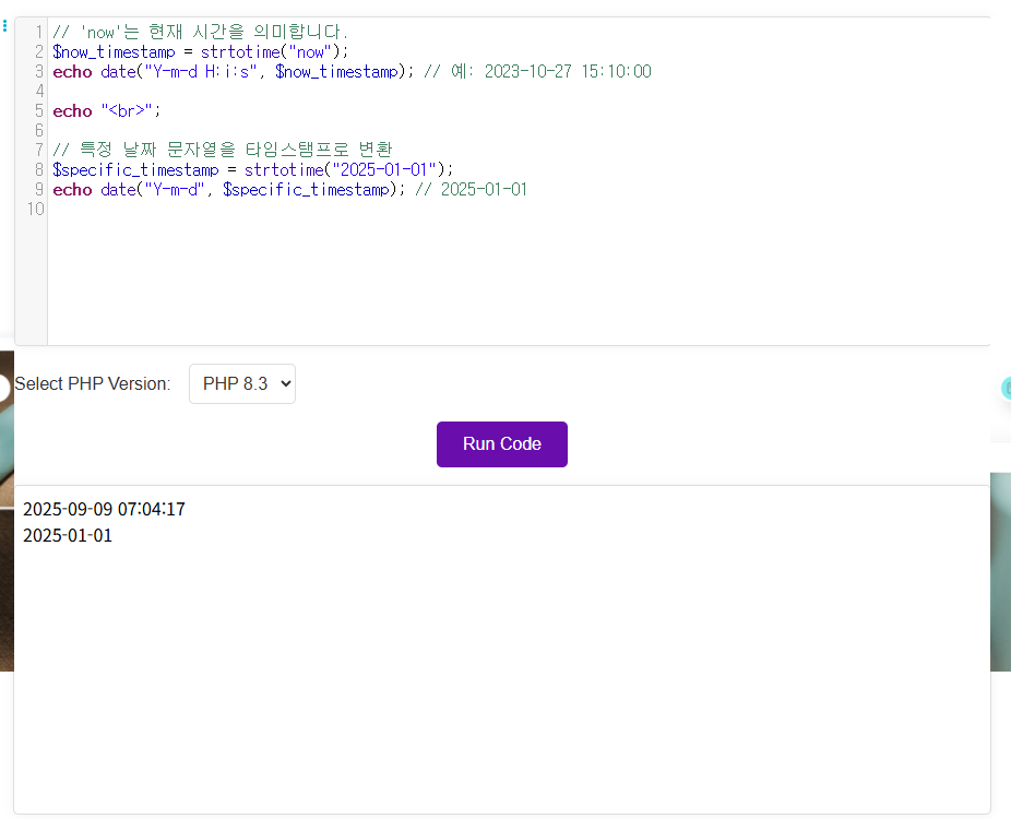 strtotime()은 String To Time 의 약자로 사람이 이해 할 수 이는 날짜/시간 형식의 문자열을 유닉스 타임스탬프로 변환합니다.