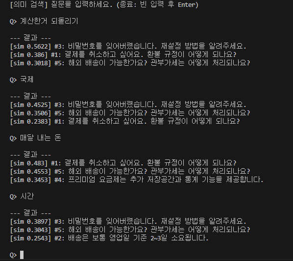 print("\n[의미 검색] 질문을 입력하세요. (종료: 빈 입력 후 Enter)\n")