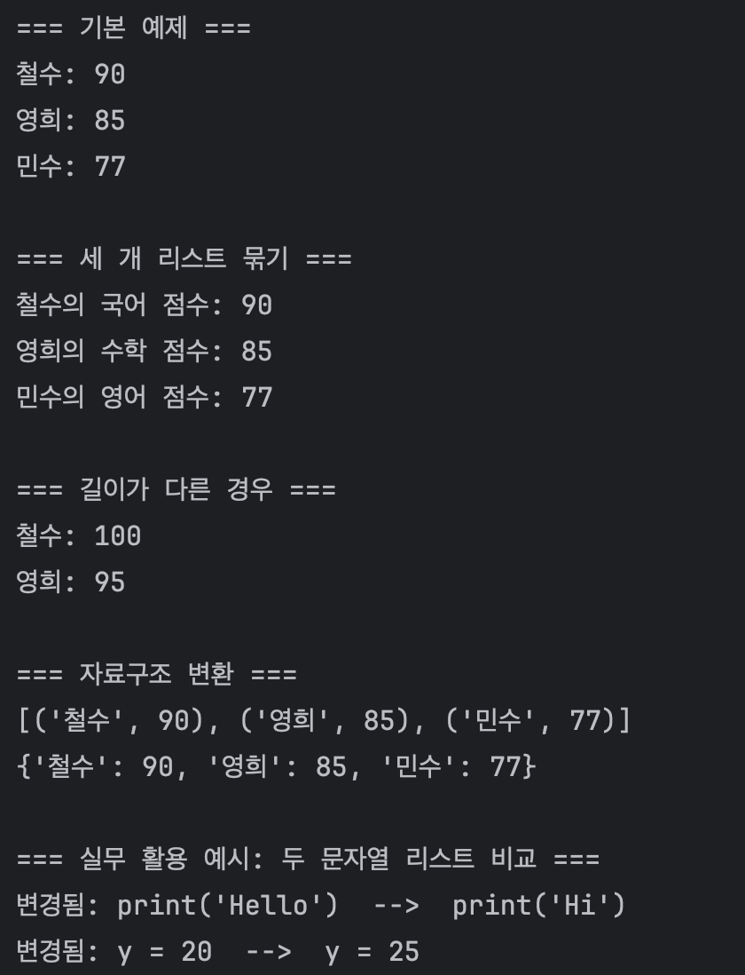 - zip()은 여러 시퀀스를 동시에 순회할 때 직관적이고 안전한 방법.