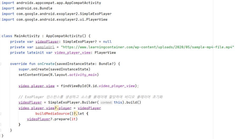 // ExoPlayer 인스턴스를 생성하고 소스를 플레이에 할당하여 비디오 플레이어 초기화