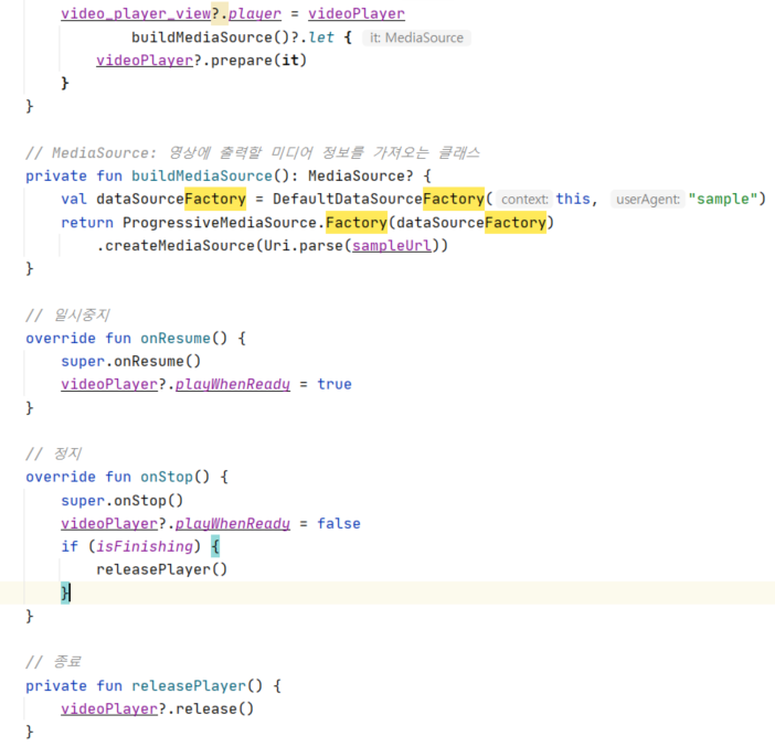 'ExoPlayer 영상 컨트롤 기능 생성' 이벤트를 누를 경우 코드가 자동으로 완성됩니다.