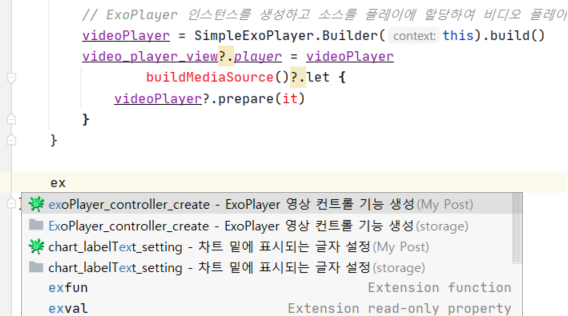 스틱코드를 활용한다면, 클래스에서 'ex' 까지만 작성했을 때 'ExoPlayer 영상 컨트롤 기능 생성' 이벤트가 나타납니다.
