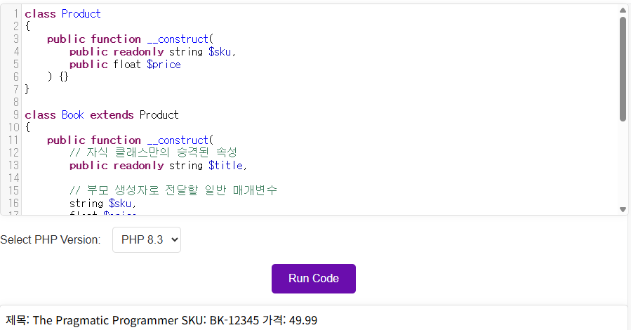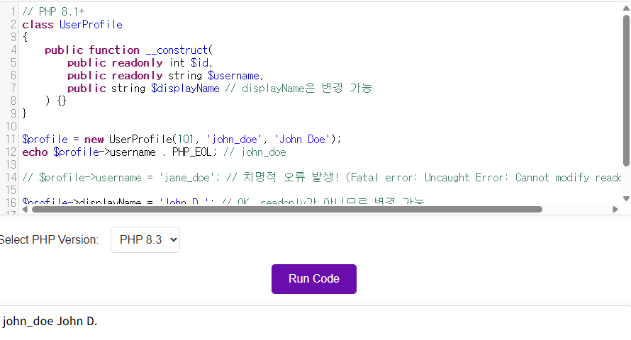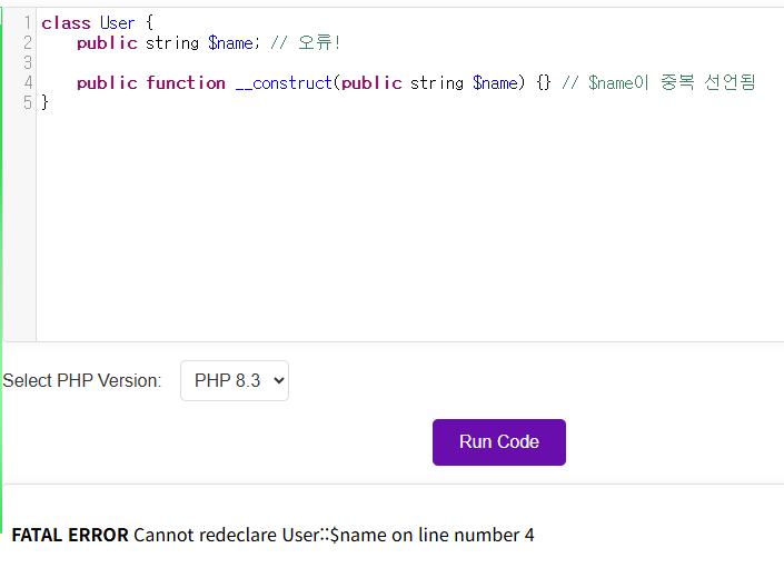주요 규칙 및 문법 가시성 제어자 필수: public, protected, private 중 하나가 반드시 매개변수 앞에 있어야 승격이 일어납니다. 생성자에서만 사용 가능: 이 구문은 오직 클래스 생성자(__construct)에서만 사용할 수 있습니다. var 사용 불가: 오래된 var 키워드는 사용할 수 없습니다. 중복 선언 불가: 승격된 속성과 동일한 이름의 클래스 속성을 별도로 선언할 수 없습니다.