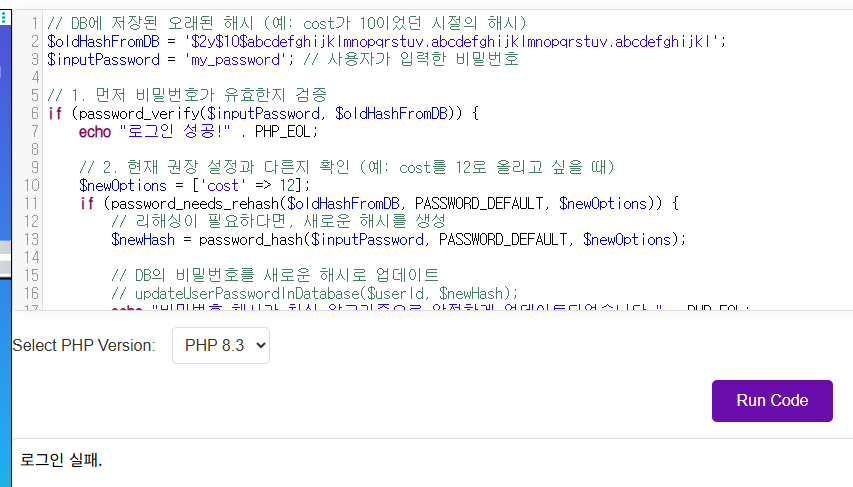 주의: 절대 if (password_hash($input, ...) == $dbHash) 와 같이 비교하면 안 됩니다. password_hash()는 매번 다른 해시를 생성하므로 항상 false가 나옵니다. 또한, == 연산자는 타이밍 공격(Timing Attack)에 취약할 수 있습니다. 반드시 password_verify()를 사용해야 합니다.