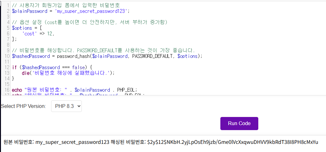 PASSWORD_DEFAULT: PHP가 설치된 버전에 따라 알고리즘을 자동으로 선택합니다. 나중에 PHP가 업데이트되어 더 좋은 알고리즘이 나오면 자동으로 업그레이드되므로 유지보수에 매우 유리합니다.