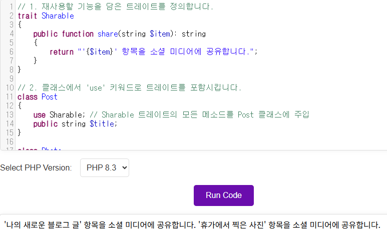 useSharable; // Sharable 트레이트의 모든 메소드를 Post 클래스에 주입