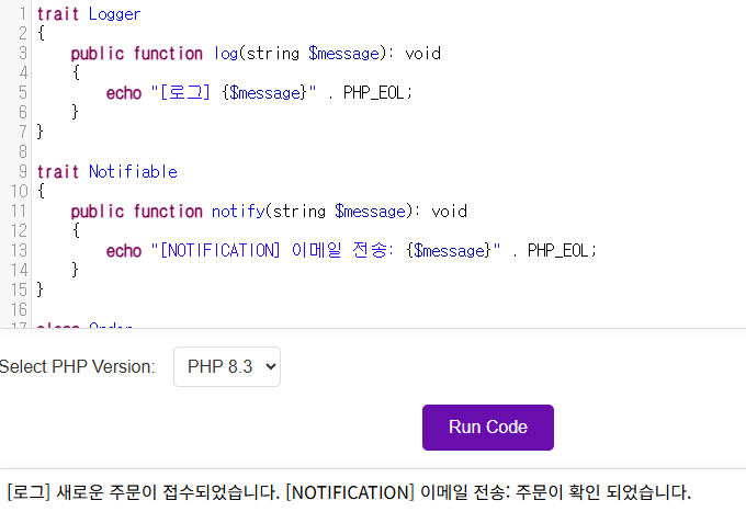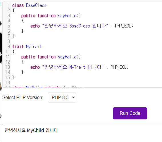 // 3. 이제 트레이트의 메소드를 클래스 자신의 메소드처럼 사용할 수 있습니다.