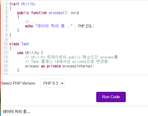 $obj->doSomethingFromB(); // TraitB의 메소드를 새 이름으로 호출