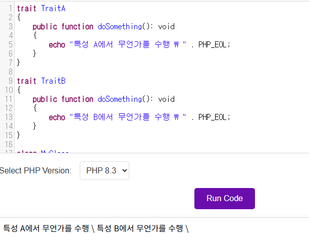 $obj->doSomething(); // TraitA의 메소드 호출