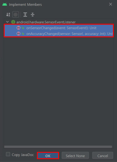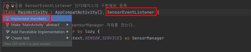 ▶ SensorEventListener 인터페이스를 추가해줍니다.