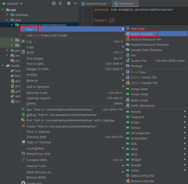 ▶ 수평 측정을 시각적으로 보여주는 뷰를 만들기 위해 TiltView.kt라는 코틀린 클래스 파일을 만들어줍니다.