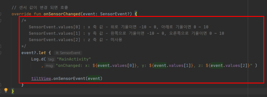 SensorEvent.values[1] : y 축 값 - 왼쪽으로 기울이면 -10 ~ 0, 오른쪽으로 기울이면 0 ~ 10