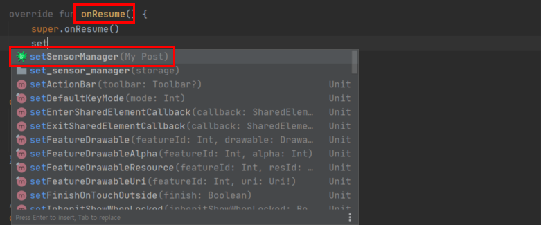 ▶ onResume에서 스틱 코드를 사용해, 사용할 센서를 등록해 줍니다.