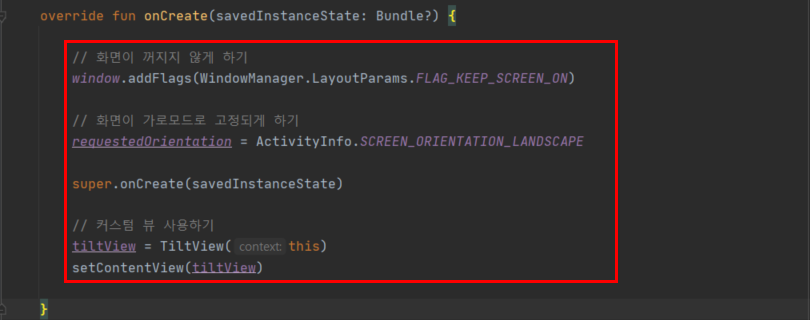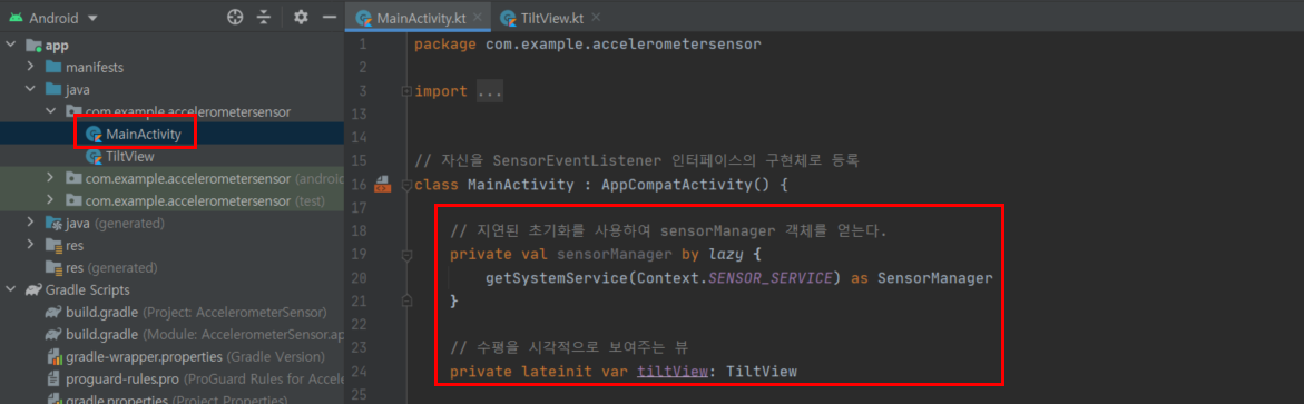 ▶ 위에서 만들어준 TiltView와 SensorManager를 선언해줍니다.