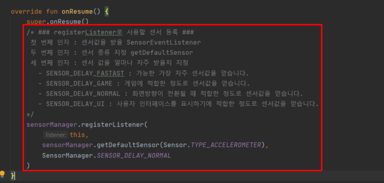 - SENSOR_DELAY_GAME : 게임에 적합한 정도로 센서값을 얻습니다.