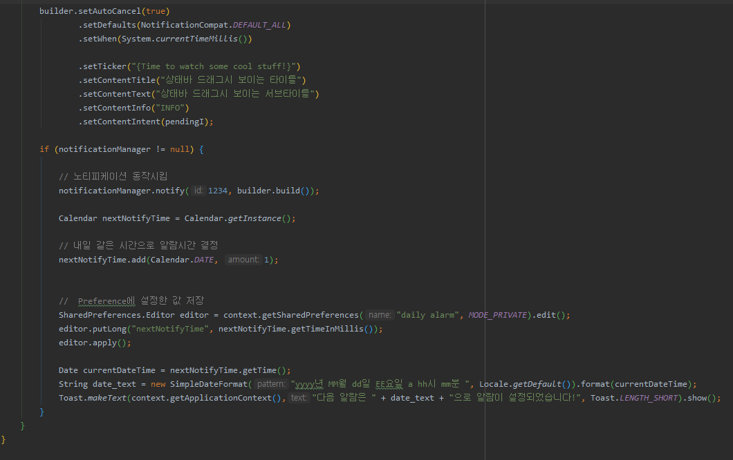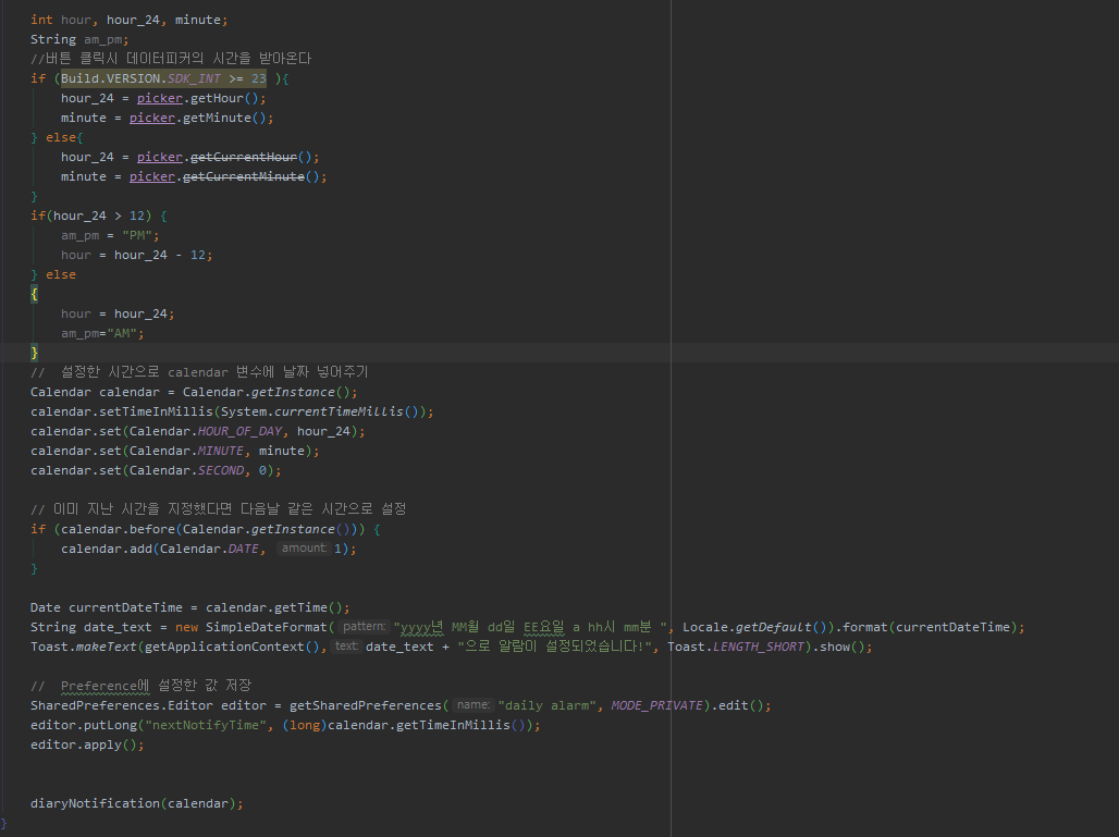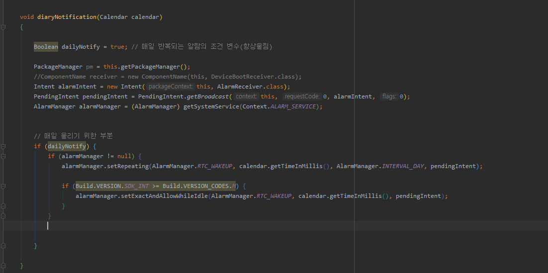 이부분은 알람을 매일 울리는 메소드입니다.