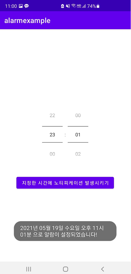 버튼을 누르게 되면 다음과 같이 토스트 메시지로 알람이 설정된 시점을 알려줍니다.