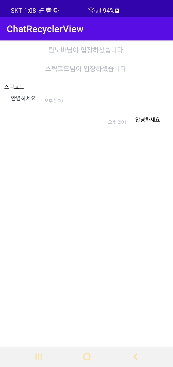 아래 포스팅은 여러가지 뷰형태를 가진 간단한 채팅 형태의 리사이클러뷰의 소스코드입니다.