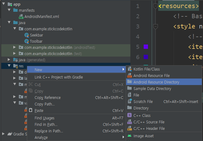 /res 경로에 menu라는 Android resource directory를 만들어 줍니다. 여기서 이 디렉토리명은 반드시 menu로 지정해 줘야 합니다. menu 디렉토리 안에 toolbar_menu.xml 파일을 생성해 줍니다.