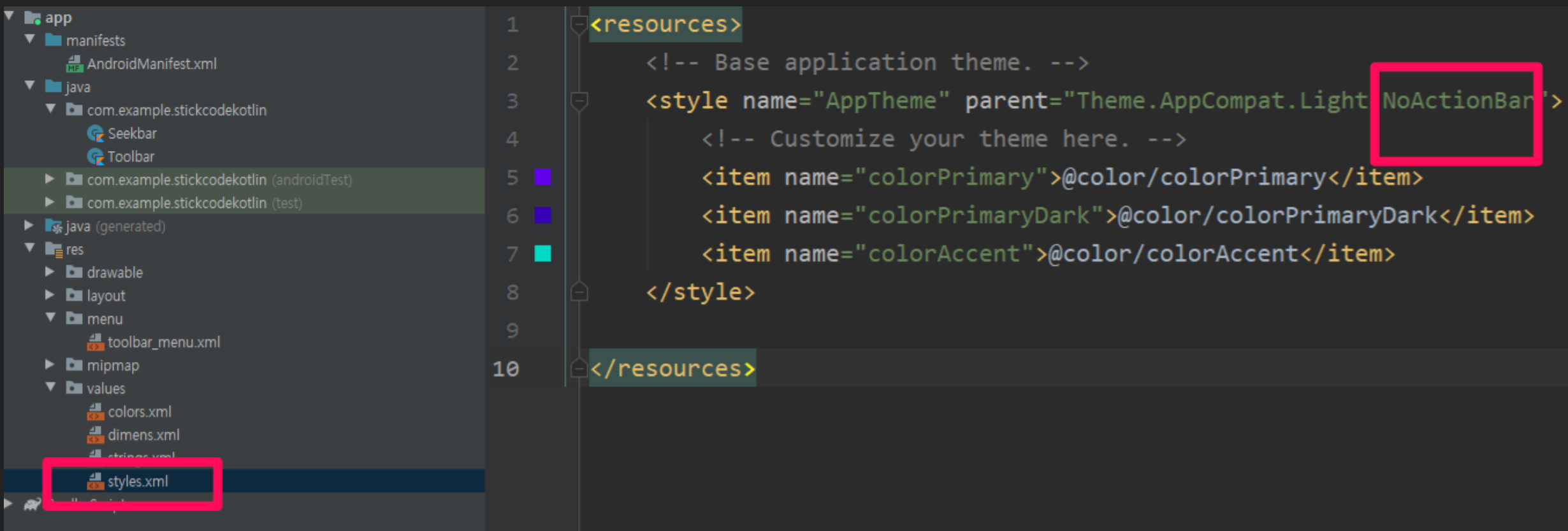 커스텀 툴바를 사용하기 위해 기존의 ActionBar를 제거하겠습니다.