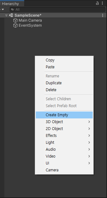 우선 유니티에서 Hierarchy창에 Create Empty를 눌러 Objact를 생성 후 이름을 GamaManager 로 바꿔 보도록 하겠습니다.